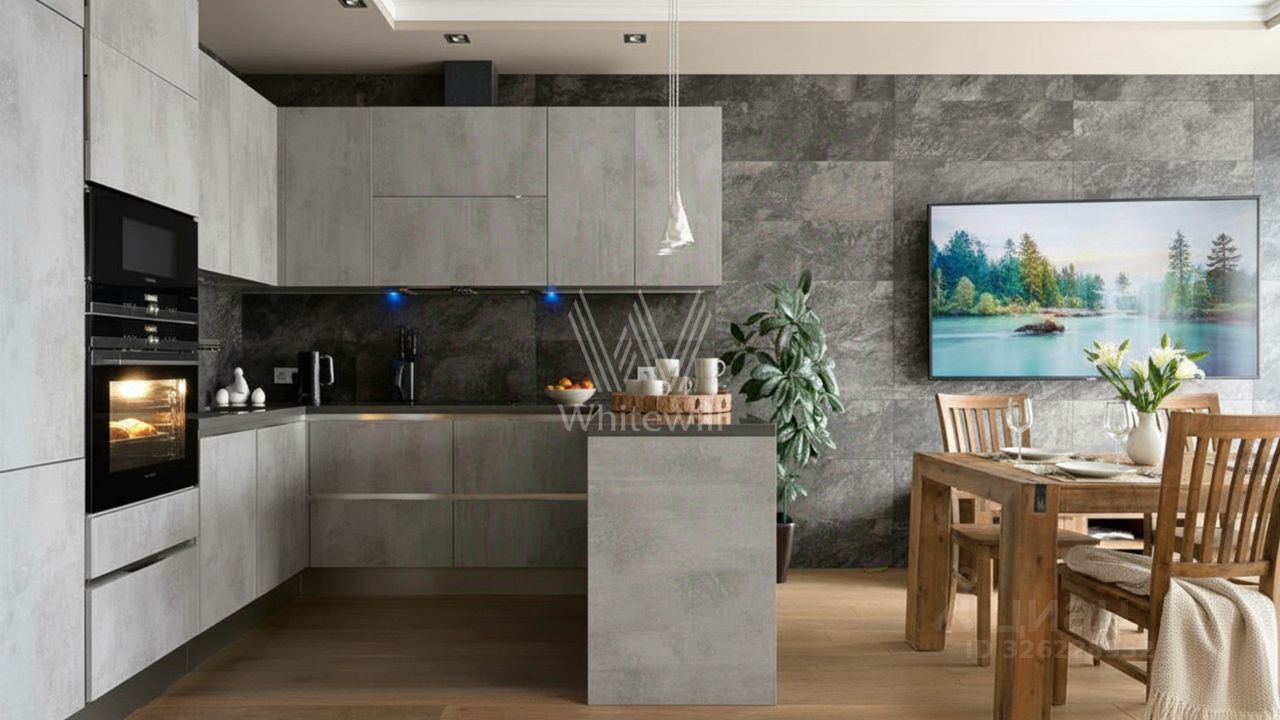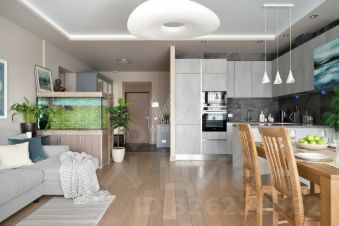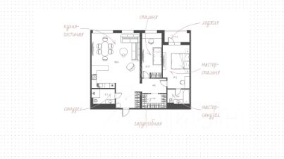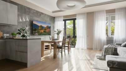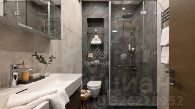 Планировка включает кухню-гостиную с обеденной зоной, мастер-спальню с собственной ванной комнатой и выходом на лоджию, вторую спальню, гостевой санузел, постирочную и прихожую. Из окон открываются виды на частный сектор. За дополнительную плату возможно приобрести 2 машино-места в подземном паркинге.