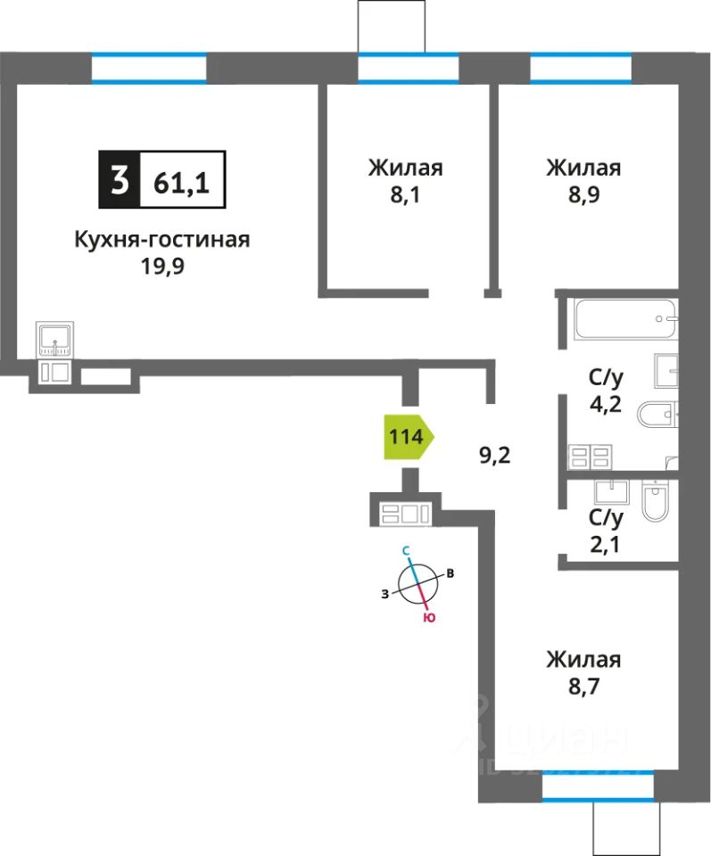 Продается полноценная трех комнатная квартира, с тремя отдельными спальнями общей площадью 61.1 кв. м расположенная на 8-ом этаже с прекрасными видовыми характеристиками на лес, квартира имеет три отдельных спальни 8,9/8,6/8,3 кв. м кухня гостиная 19,6 кв. м., два санузла. Квартира с с отделкой ВАЙТ БОКС.