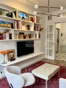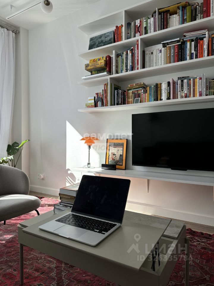 Большая гостиная с высокими стеклянными дверями. Воздушный стеллаж для книг и ТВ.