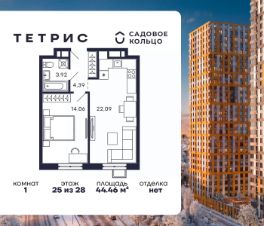 Продается квартира в ЖК Тетрис с 1 спальней на 25 этаже 28 этажного дома. Общая площадь: 44.46 кв.м. Высота потолков 2.95 м. Срок сдачи 2 квартал 2026 г. Эскроу-счет. Застройщик ГК "Садовое кольцо".