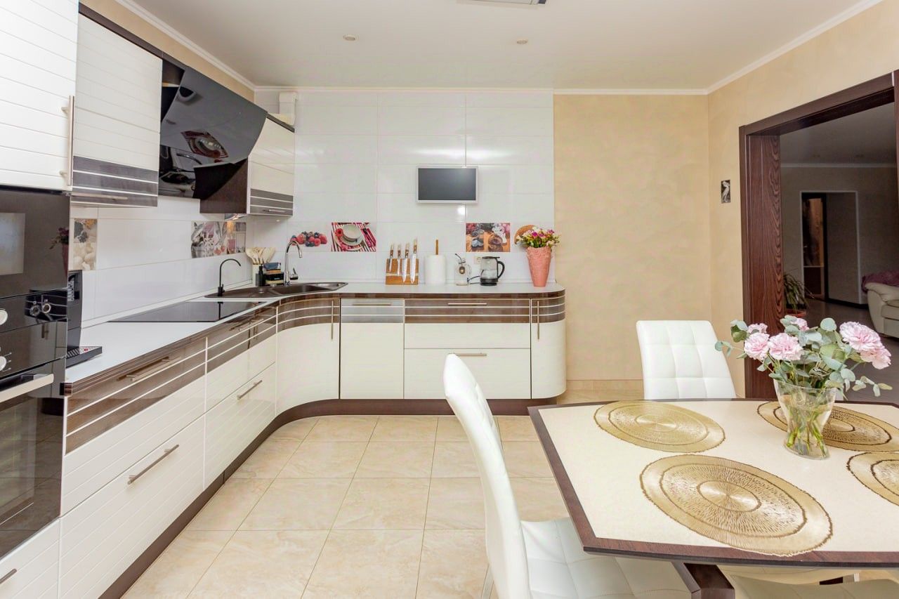 Открытый зал, проходная кухня, спальная, детская, кабинет, два санузла, гардеробная.