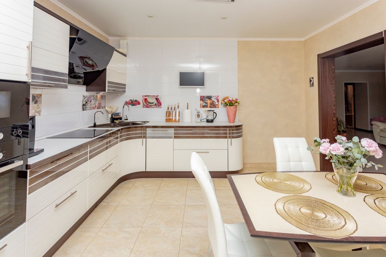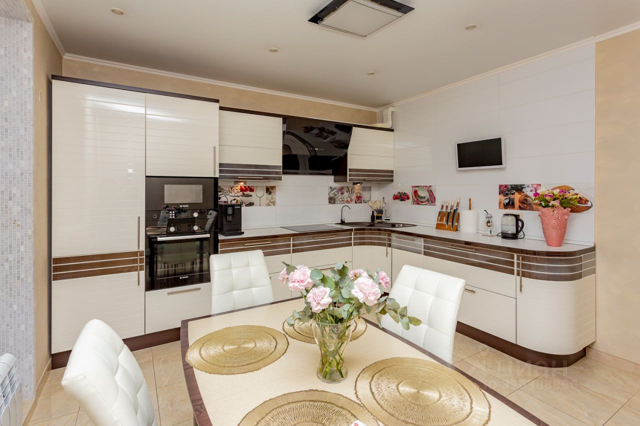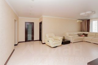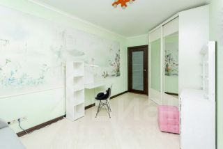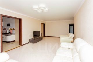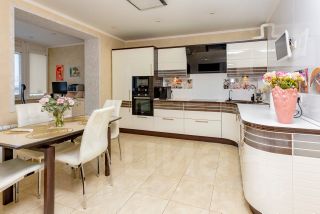 Открытый вместительный зал с диваном, пневмокреслом и панелью. Проходная мастер-кухня с выходом на балкон, который оборудован под кабинет. Уютная спальная комната. Светлая детская комната. Два санузла. Гардеробное помещение.