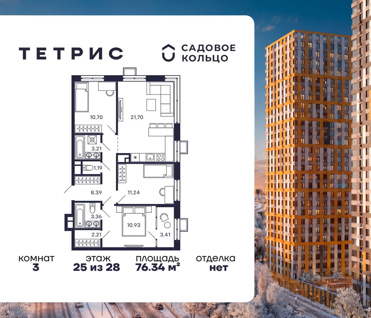 Продается квартира в ЖК Тетрис с 3 спальнями на 25 этаже 28 этажного дома. Общая площадь: 76.34 кв.м. Высота потолков 2.95 м. Срок сдачи 2 квартал 2026 г. Эскроу-счет. Застройщик ГК "Садовое кольцо".