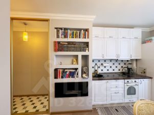 В небольшой кухне-гостиной есть библиотека которую мы спроектировали самостоятельно, установлен био-камин с настоящим огнем по технике безопасности (изолирован).