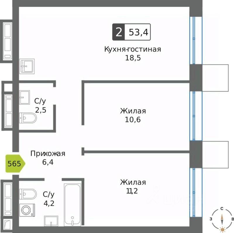 Общая площадь53,4 м²