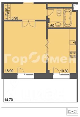 Площадь квартиры составляет 39,6 м2, плюс терраса 14,5 м2. Квартира без отделки.