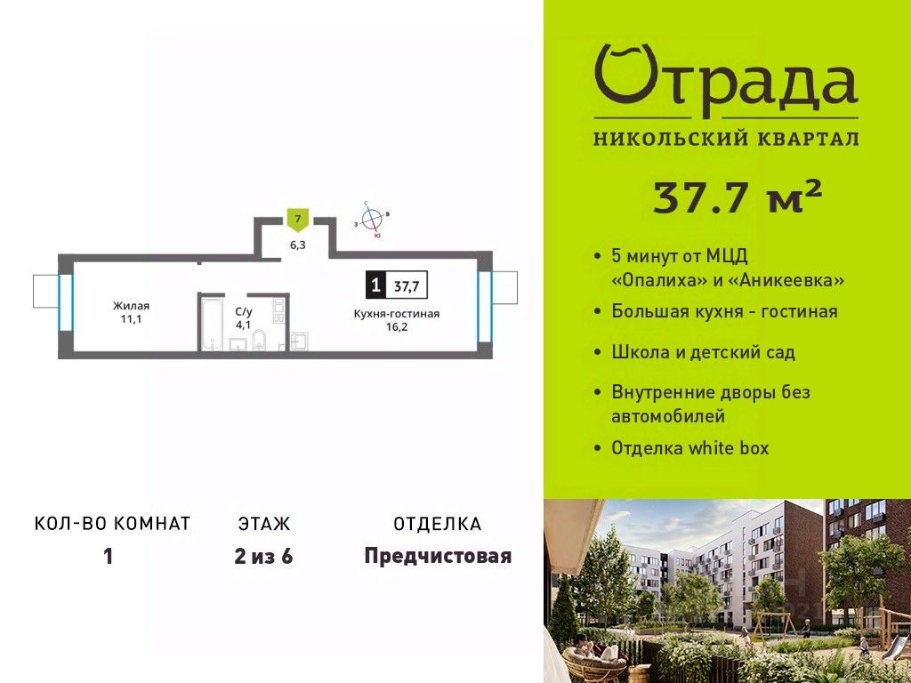 Однокомнатная квартира (евродвушка) с просторной кухней-гостиной Однокомнатная квартира (евродвушка) с просторной кухней-гостиной в жилом комплексе комфорт-класса "Никольский квартал Отрада". Планировка выполнена по современным стандартам и отличается повышенным комфортом. Квартал расположен в удачной локации, которая сочетает благоприятную экологическую обстановку с прекрасной транспортной доступностью. Проектом предусмотрены 14 корпусов высотой 6-9 этажей, а также муниципальная школа, один муниципальный и один частный детский сад, два наземных многоуровневых паркинга с кладовыми помещениями. Надежный застройщик ГК "Отрада" с высочайшим рейтингом 5 звезд от портала ЕРЗ. Все корпуса во всех ЖК сданы раньше срока!