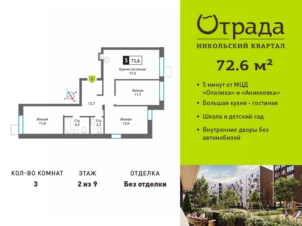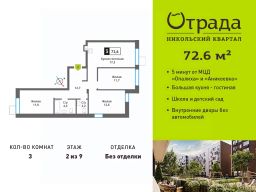 Трёхкомнатная квартира с просторной кухней-гостиной Трёхкомнатная квартира с просторной кухней-гостиной в жилом комплексе комфорт-класса "Никольский квартал Отрада". Планировка выполнена по современным стандартам и отличается повышенным комфортом. Квартал расположен в удачной локации, которая сочетает благоприятную экологическую обстановку с прекрасной транспортной доступностью. Проектом предусмотрены 14 корпусов высотой 6-9 этажей, а также муниципальная школа, один муниципальный и один частный детский сад, два наземных многоуровневых паркинга с кладовыми помещениями. Надежный застройщик ГК "Отрада" с высочайшим рейтингом 5 звезд от портала ЕРЗ. Все корпуса во всех ЖК сданы раньше срока!
