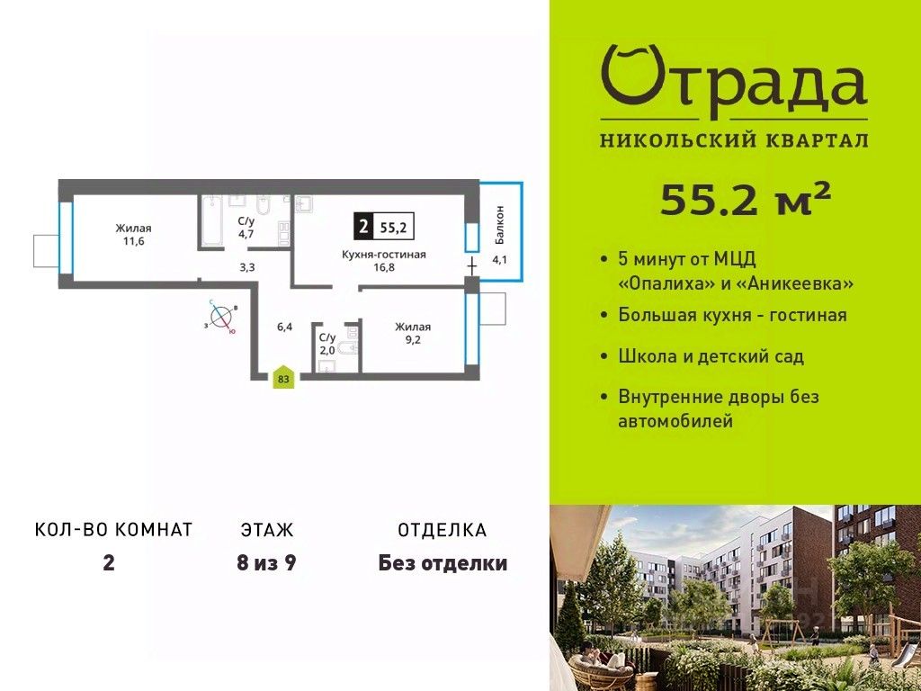 Двухкомнатная квартира (евротрешка) с просторной кухней-гостиной в жилом комплексе комфорт-класса "Никольский квартал Отрада". Планировка выполнена по современным стандартам и отличается повышенным комфортом. Квартал расположен в удачной локации, которая сочетает благоприятную экологическую обстановку с прекрасной транспортной доступностью. Проектом предусмотрены 14 корпусов высотой 6-9 этажей, а также муниципальная школа, один муниципальный и один частный детский сад, два наземных многоуровневых паркинга с кладовыми помещениями. Надежный застройщик ГК "Отрада" с высочайшим рейтингом 5 звезд от портала ЕРЗ. Все корпуса во всех ЖК сданы раньше срока!