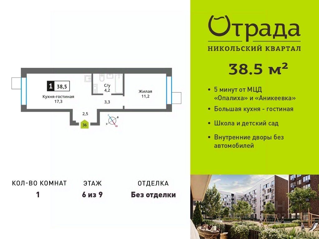 Однокомнатная квартира (евродвушка) с просторной кухней-гостиной Однокомнатная квартира (евродвушка) с просторной кухней-гостиной в жилом комплексе комфорт-класса "Никольский квартал Отрада". Планировка выполнена по современным стандартам и отличается повышенным комфортом. Квартал расположен в удачной локации, которая сочетает благоприятную экологическую обстановку с прекрасной транспортной доступностью. Проектом предусмотрены 14 корпусов высотой 6-9 этажей, а также муниципальная школа, один муниципальный и один частный детский сад, два наземных многоуровневых паркинга с кладовыми помещениями. Надежный застройщик ГК "Отрада" с высочайшим рейтингом 5 звезд от портала ЕРЗ. Все корпуса во всех ЖК сданы раньше срока!