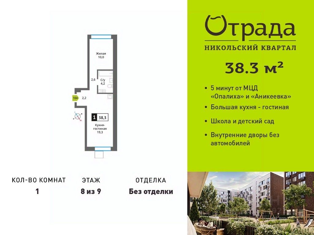 Однокомнатная квартира (евродвушка) с просторной кухней-гостиной в жилом комплексе комфорт-класса "Никольский квартал Отрада". Планировка выполнена по современным стандартам и отличается повышенным комфортом. Квартал расположен в удачной локации, которая сочетает благоприятную экологическую обстановку с прекрасной транспортной доступностью. Проектом предусмотрены 14 корпусов высотой 6-9 этажей, а также муниципальная школа, один муниципальный и один частный детский сад, два наземных многоуровневых паркинга с кладовыми помещениями. Надежный застройщик ГК "Отрада" с высочайшим рейтингом 5 звезд от портала ЕРЗ. Все корпуса во всех ЖК сданы раньше срока!
