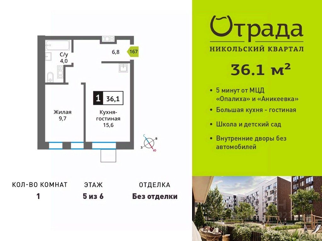 Однокомнатная квартира (евродвушка) с просторной кухней-гостиной Однокомнатная квартира (евродвушка) с просторной кухней-гостиной в жилом комплексе комфорт-класса "Никольский квартал Отрада". Планировка выполнена по современным стандартам и отличается повышенным комфортом. Квартал расположен в удачной локации, которая сочетает благоприятную экологическую обстановку с прекрасной транспортной доступностью. Проектом предусмотрены 14 корпусов высотой 6-9 этажей, а также муниципальная школа, один муниципальный и один частный детский сад, два наземных многоуровневых паркинга с кладовыми помещениями. Надежный застройщик ГК "Отрада" с высочайшим рейтингом 5 звезд от портала ЕРЗ. Все корпуса во всех ЖК сданы раньше срока!