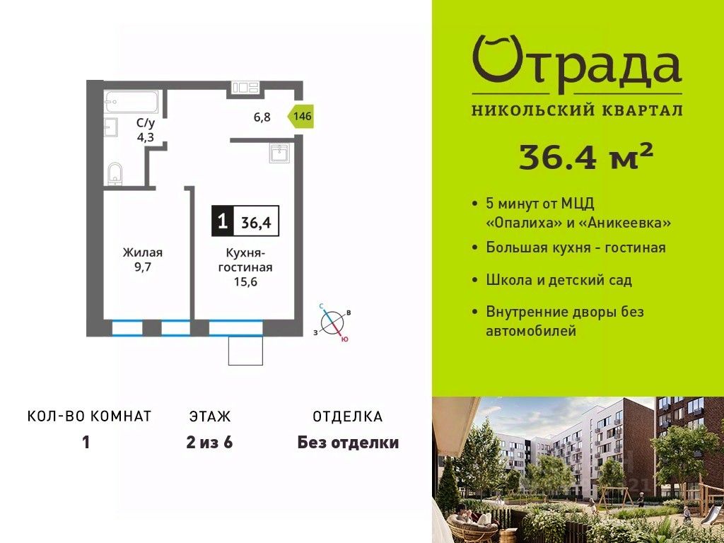 Однокомнатная квартира (евродвушка) с просторной кухней-гостиной в жилом комплексе комфорт-класса "Никольский квартал Отрада". Планировка выполнена по современным стандартам и отличается повышенным комфортом. Квартал расположен в удачной локации, которая сочетает благоприятную экологическую обстановку с прекрасной транспортной доступностью. Проектом предусмотрены 14 корпусов высотой 6-9 этажей, а также муниципальная школа, один муниципальный и один частный детский сад, два наземных многоуровневых паркинга с кладовыми помещениями. Надежный застройщик ГК "Отрада" с высочайшим рейтингом 5 звезд от портала ЕРЗ. Все корпуса во всех ЖК сданы раньше срока!
