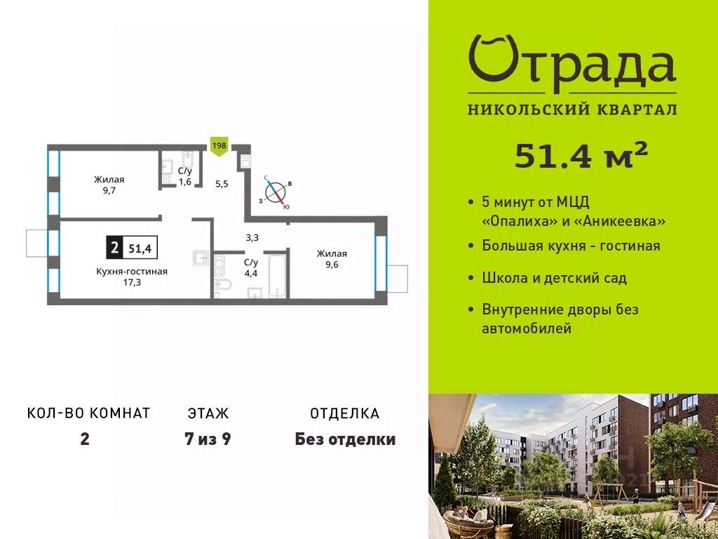 Двухкомнатная квартира (евротрешка) с просторной кухней-гостиной в жилом комплексе комфорт-класса "Никольский квартал Отрада". Планировка выполнена по современным стандартам и отличается повышенным комфортом. Квартал расположен в удачной локации, которая сочетает благоприятную экологическую обстановку с прекрасной транспортной доступностью. Проектом предусмотрены 14 корпусов высотой 6-9 этажей, а также муниципальная школа, один муниципальный и один частный детский сад, два наземных многоуровневых паркинга с кладовыми помещениями. Надежный застройщик ГК "Отрада" с высочайшим рейтингом 5 звезд от портала ЕРЗ. Все корпуса во всех ЖК сданы раньше срока!