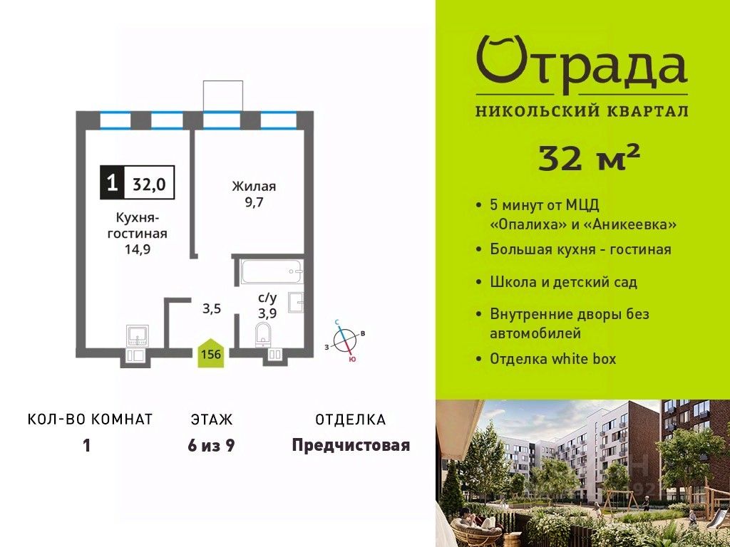 Однокомнатная квартира (евродвушка) с просторной кухней-гостиной Однокомнатная квартира (евродвушка) с просторной кухней-гостиной в жилом комплексе комфорт-класса "Никольский квартал Отрада". Планировка выполнена по современным стандартам и отличается повышенным комфортом. Квартал расположен в удачной локации, которая сочетает благоприятную экологическую обстановку с прекрасной транспортной доступностью. Проектом предусмотрены 14 корпусов высотой 6-9 этажей, а также муниципальная школа, один муниципальный и один частный детский сад, два наземных многоуровневых паркинга с кладовыми помещениями. Надежный застройщик ГК "Отрада" с высочайшим рейтингом 5 звезд от портала ЕРЗ. Все корпуса во всех ЖК сданы раньше срока!