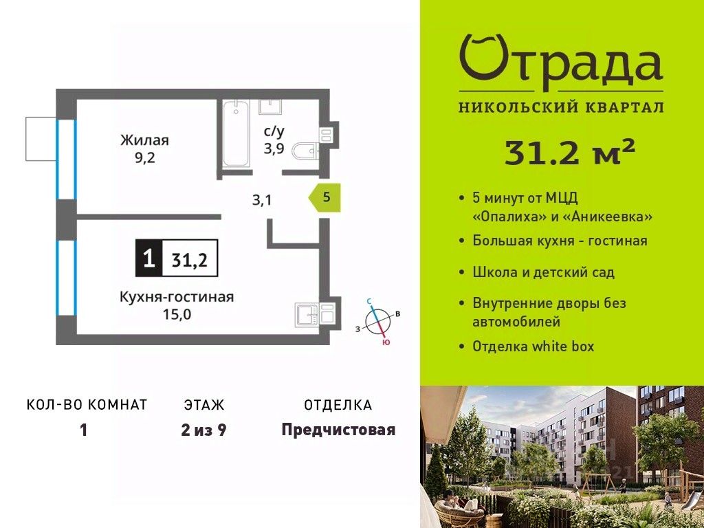 Однокомнатная квартира (евродвушка) с просторной кухней-гостиной в жилом комплексе комфорт-класса "Никольский квартал Отрада". Планировка выполнена по современным стандартам и отличается повышенным комфортом. Квартал расположен в удачной локации, которая сочетает благоприятную экологическую обстановку с прекрасной транспортной доступностью. Проектом предусмотрены 14 корпусов высотой 6-9 этажей, а также муниципальная школа, один муниципальный и один частный детский сад, два наземных многоуровневых паркинга с кладовыми помещениями. Надежный застройщик ГК "Отрада" с высочайшим рейтингом 5 звезд от портала ЕРЗ. Все корпуса во всех ЖК сданы раньше срока!