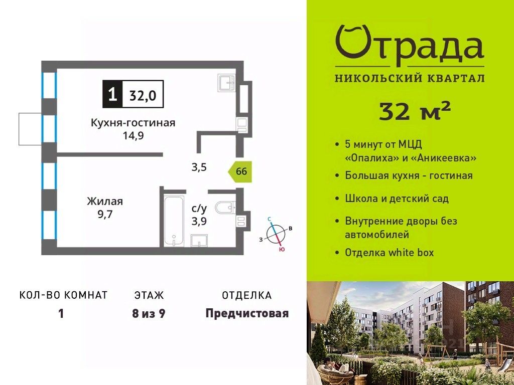 Однокомнатная квартира (евродвушка) с просторной кухней-гостиной Однокомнатная квартира (евродвушка) с просторной кухней-гостиной в жилом комплексе комфорт-класса "Никольский квартал Отрада". Планировка выполнена по современным стандартам и отличается повышенным комфортом. Квартал расположен в удачной локации, которая сочетает благоприятную экологическую обстановку с прекрасной транспортной доступностью. Проектом предусмотрены 14 корпусов высотой 6-9 этажей, а также муниципальная школа, один муниципальный и один частный детский сад, два наземных многоуровневых паркинга с кладовыми помещениями. Надежный застройщик ГК "Отрада" с высочайшим рейтингом 5 звезд от портала ЕРЗ. Все корпуса во всех ЖК сданы раньше срока!
