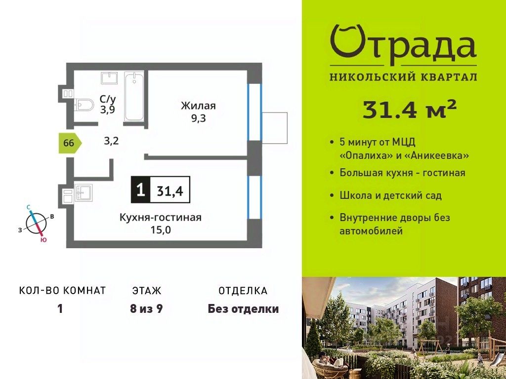Однокомнатная квартира (евродвушка) с просторной кухней-гостиной Однокомнатная квартира (евродвушка) с просторной кухней-гостиной в жилом комплексе комфорт-класса "Никольский квартал Отрада". Планировка выполнена по современным стандартам и отличается повышенным комфортом. Квартал расположен в удачной локации, которая сочетает благоприятную экологическую обстановку с прекрасной транспортной доступностью. Проектом предусмотрены 14 корпусов высотой 6-9 этажей, а также муниципальная школа, один муниципальный и один частный детский сад, два наземных многоуровневых паркинга с кладовыми помещениями. Надежный застройщик ГК "Отрада" с высочайшим рейтингом 5 звезд от портала ЕРЗ. Все корпуса во всех ЖК сданы раньше срока!