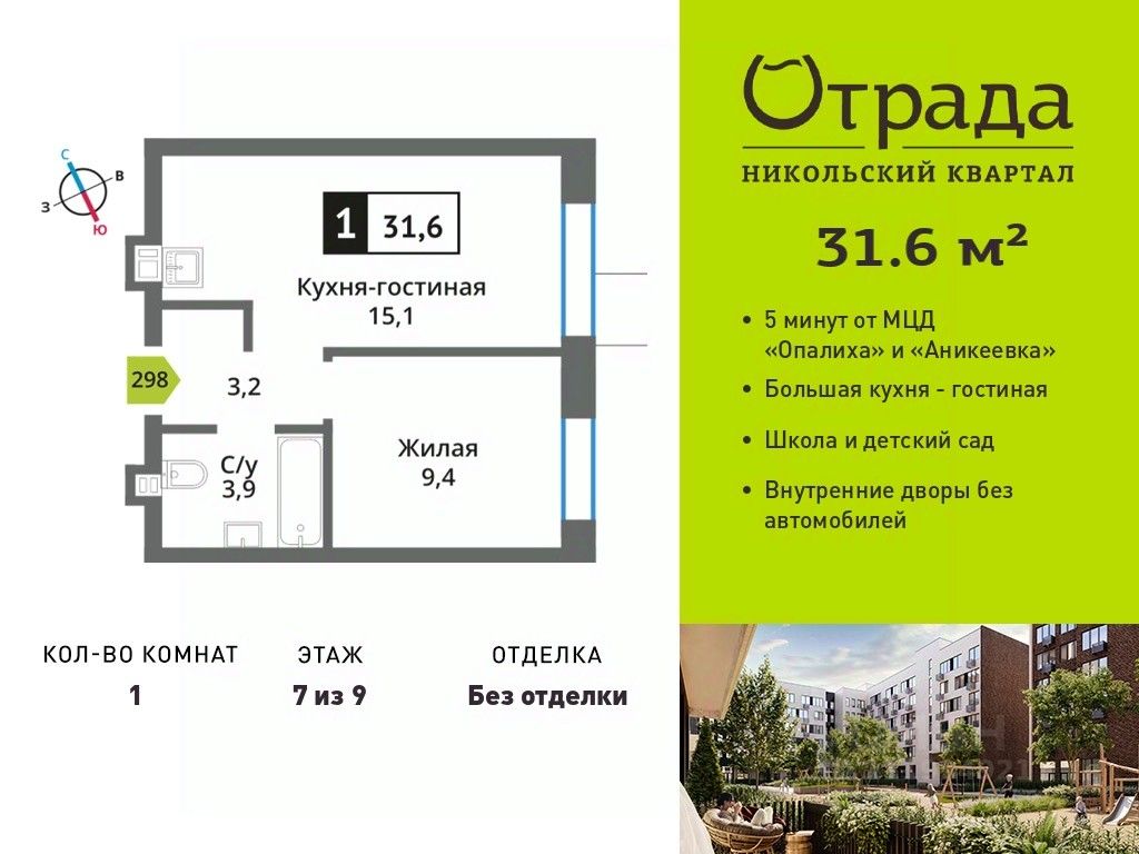 Однокомнатная квартира (евродвушка) с просторной кухней-гостиной Однокомнатная квартира (евродвушка) с просторной кухней-гостиной в жилом комплексе комфорт-класса "Никольский квартал Отрада". Планировка выполнена по современным стандартам и отличается повышенным комфортом. Квартал расположен в удачной локации, которая сочетает благоприятную экологическую обстановку с прекрасной транспортной доступностью. Проектом предусмотрены 14 корпусов высотой 6-9 этажей, а также муниципальная школа, один муниципальный и один частный детский сад, два наземных многоуровневых паркинга с кладовыми помещениями. Надежный застройщик ГК "Отрада" с высочайшим рейтингом 5 звезд от портала ЕРЗ. Все корпуса во всех ЖК сданы раньше срока!