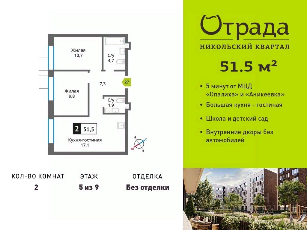 Двухкомнатная квартира (евротрешка) с просторной кухней-гостиной в жилом комплексе комфорт-класса "Никольский квартал Отрада". Планировка выполнена по современным стандартам и отличается повышенным комфортом. Квартал расположен в удачной локации, которая сочетает благоприятную экологическую обстановку с прекрасной транспортной доступностью. Проектом предусмотрены 14 корпусов высотой 6-9 этажей, а также муниципальная школа, один муниципальный и один частный детский сад, два наземных многоуровневых паркинга с кладовыми помещениями. Надежный застройщик ГК "Отрада" с высочайшим рейтингом 5 звезд от портала ЕРЗ. Все корпуса во всех ЖК сданы раньше срока!