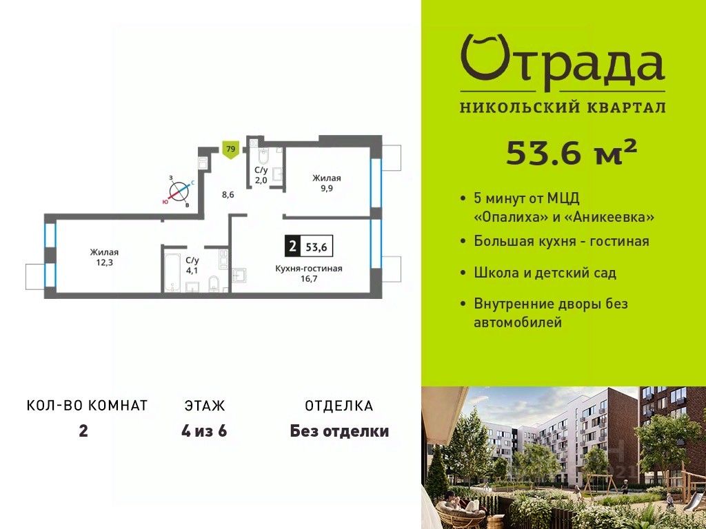 Двухкомнатная квартира (евротрешка) с просторной кухней-гостиной Двухкомнатная квартира (евротрешка) с просторной кухней-гостиной в жилом комплексе комфорт-класса "Никольский квартал Отрада". Планировка выполнена по современным стандартам и отличается повышенным комфортом. Квартал расположен в удачной локации, которая сочетает благоприятную экологическую обстановку с прекрасной транспортной доступностью. Проектом предусмотрены 14 корпусов высотой 6-9 этажей, а также муниципальная школа, один муниципальный и один частный детский сад, два наземных многоуровневых паркинга с кладовыми помещениями. Надежный застройщик ГК "Отрада" с высочайшим рейтингом 5 звезд от портала ЕРЗ. Все корпуса во всех ЖК сданы раньше срока!
