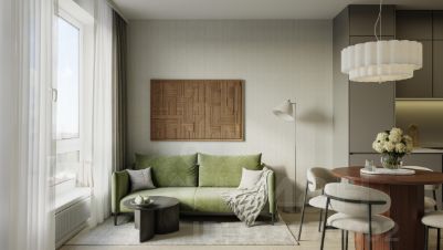 В варианте с готовой отделкой мы поклеили обои под покраску, постелили полы в комнатах и санузлах, выполнили отделку стен. Установили сантехнику и межкомнатные двери, провели электрику. Это лучшее соотношение цены, качества и затраченного времени. Осталось только выбрать место для обеденного стола и удобного дивана.