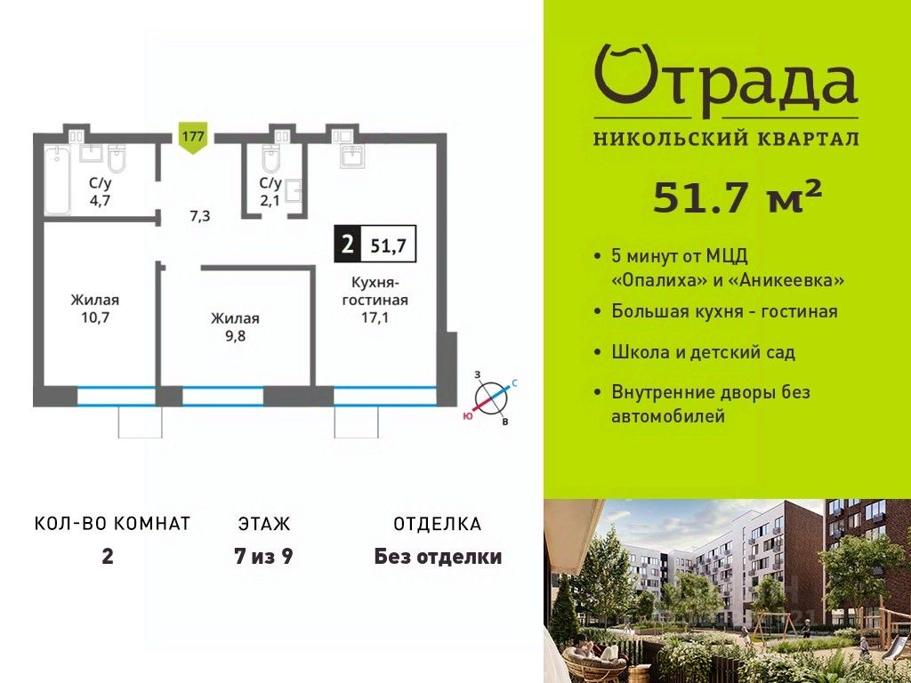Двухкомнатная квартира (евротрешка) с просторной кухней-гостиной Двухкомнатная квартира (евротрешка) с просторной кухней-гостиной в жилом комплексе комфорт-класса "Никольский квартал Отрада". Планировка выполнена по современным стандартам и отличается повышенным комфортом. Квартал расположен в удачной локации, которая сочетает благоприятную экологическую обстановку с прекрасной транспортной доступностью. Проектом предусмотрены 14 корпусов высотой 6-9 этажей, а также муниципальная школа, один муниципальный и один частный детский сад, два наземных многоуровневых паркинга с кладовыми помещениями. Надежный застройщик ГК "Отрада" с высочайшим рейтингом 5 звезд от портала ЕРЗ. Все корпуса во всех ЖК сданы раньше срока!