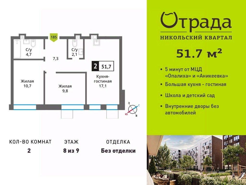 Двухкомнатная квартира (евротрешка) с просторной кухней-гостиной в жилом комплексе комфорт-класса "Никольский квартал Отрада". Планировка выполнена по современным стандартам и отличается повышенным комфортом. Квартал расположен в удачной локации, которая сочетает благоприятную экологическую обстановку с прекрасной транспортной доступностью. Проектом предусмотрены 14 корпусов высотой 6-9 этажей, а также муниципальная школа, один муниципальный и один частный детский сад, два наземных многоуровневых паркинга с кладовыми помещениями. Надежный застройщик ГК "Отрада" с высочайшим рейтингом 5 звезд от портала ЕРЗ. Все корпуса во всех ЖК сданы раньше срока!