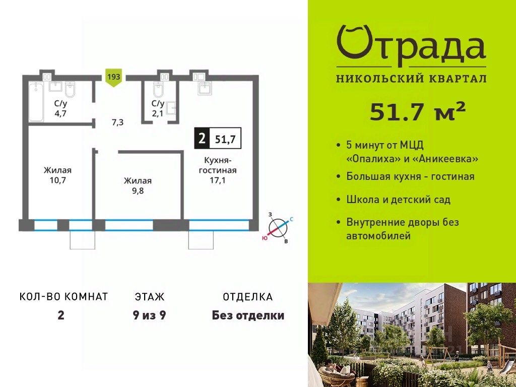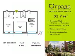 Двухкомнатная квартира (евротрешка) с просторной кухней-гостиной Двухкомнатная квартира (евротрешка) с просторной кухней-гостиной в жилом комплексе комфорт-класса "Никольский квартал Отрада". Планировка выполнена по современным стандартам и отличается повышенным комфортом. Квартал расположен в удачной локации, которая сочетает благоприятную экологическую обстановку с прекрасной транспортной доступностью. Проектом предусмотрены 14 корпусов высотой 6-9 этажей, а также муниципальная школа, один муниципальный и один частный детский сад, два наземных многоуровневых паркинга с кладовыми помещениями. Надежный застройщик ГК "Отрада" с высочайшим рейтингом 5 звезд от портала ЕРЗ. Все корпуса во всех ЖК сданы раньше срока!