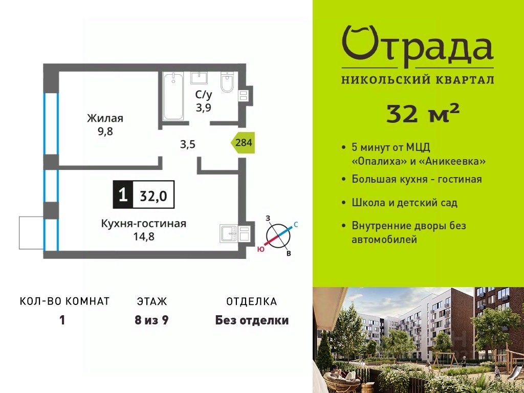 Однокомнатная квартира (евродвушка) с просторной кухней-гостиной Однокомнатная квартира (евродвушка) с просторной кухней-гостиной в жилом комплексе комфорт-класса "Никольский квартал Отрада". Планировка выполнена по современным стандартам и отличается повышенным комфортом. Квартал расположен в удачной локации, которая сочетает благоприятную экологическую обстановку с прекрасной транспортной доступностью. Проектом предусмотрены 14 корпусов высотой 6-9 этажей, а также муниципальная школа, один муниципальный и один частный детский сад, два наземных многоуровневых паркинга с кладовыми помещениями. Надежный застройщик ГК "Отрада" с высочайшим рейтингом 5 звезд от портала ЕРЗ. Все корпуса во всех ЖК сданы раньше срока!