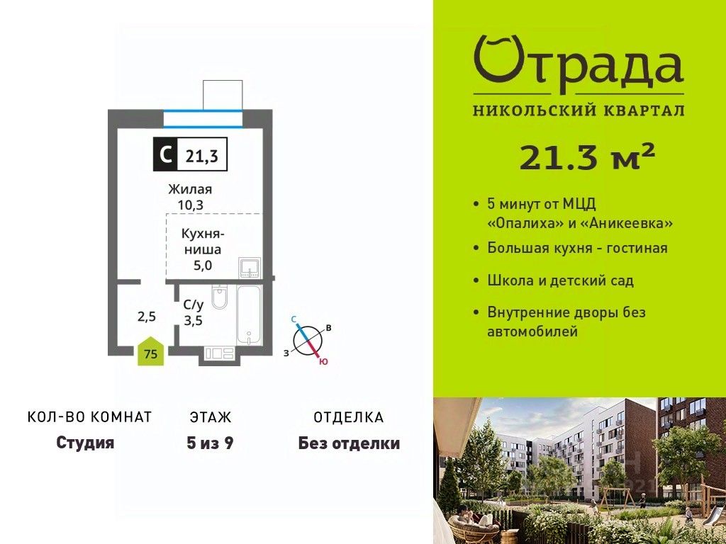 Квартира-студия с компактной кухней-нишей Квартира-студия с компактной кухней-нишей в жилом комплексе комфорт-класса "Никольский квартал Отрада". Планировка выполнена по современным стандартам и отличается повышенным комфортом. Квартал расположен в удачной локации, которая сочетает благоприятную экологическую обстановку с прекрасной транспортной доступностью. Проектом предусмотрены 14 корпусов высотой 6-9 этажей, а также муниципальная школа, один муниципальный и один частный детский сад, два наземных многоуровневых паркинга с кладовыми помещениями. Надежный застройщик ГК "Отрада" с высочайшим рейтингом 5 звезд от портала ЕРЗ. Все корпуса во всех ЖК сданы раньше срока!