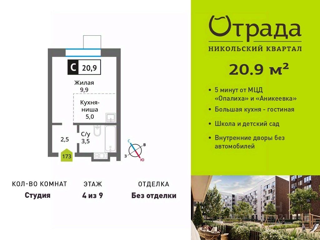 Квартира-студия с компактной кухней-нишей Квартира-студия с компактной кухней-нишей в жилом комплексе комфорт-класса "Никольский квартал Отрада". Планировка выполнена по современным стандартам и отличается повышенным комфортом. Квартал расположен в удачной локации, которая сочетает благоприятную экологическую обстановку с прекрасной транспортной доступностью. Проектом предусмотрены 14 корпусов высотой 6-9 этажей, а также муниципальная школа, один муниципальный и один частный детский сад, два наземных многоуровневых паркинга с кладовыми помещениями. Надежный застройщик ГК "Отрада" с высочайшим рейтингом 5 звезд от портала ЕРЗ. Все корпуса во всех ЖК сданы раньше срока!