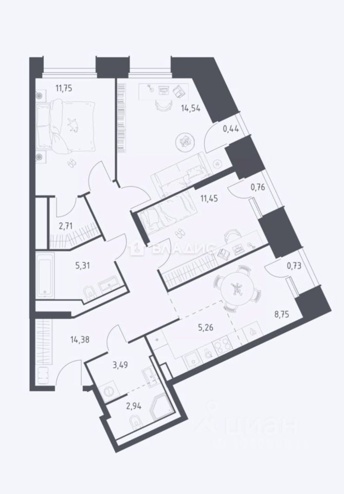 - Просторная кухня - гостиная, 3 спальни, 2 санузла, прачечная, 3 лоджии и гардеробная комната;