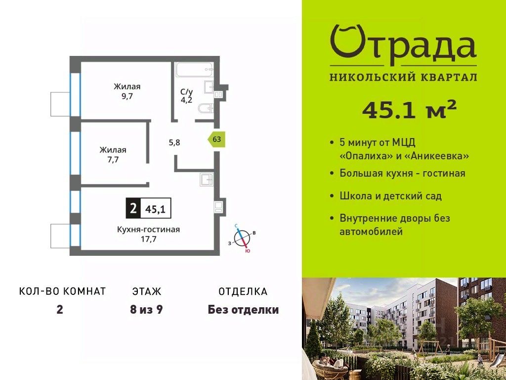 Двухкомнатная квартира (евротрешка) с просторной кухней-гостиной в жилом комплексе комфорт-класса "Никольский квартал Отрада". Планировка выполнена по современным стандартам и отличается повышенным комфортом. Квартал расположен в удачной локации, которая сочетает благоприятную экологическую обстановку с прекрасной транспортной доступностью. Проектом предусмотрены 14 корпусов высотой 6-9 этажей, а также муниципальная школа, один муниципальный и один частный детский сад, два наземных многоуровневых паркинга с кладовыми помещениями. Надежный застройщик ГК "Отрада" с высочайшим рейтингом 5 звезд от портала ЕРЗ. Все корпуса во всех ЖК сданы раньше срока!