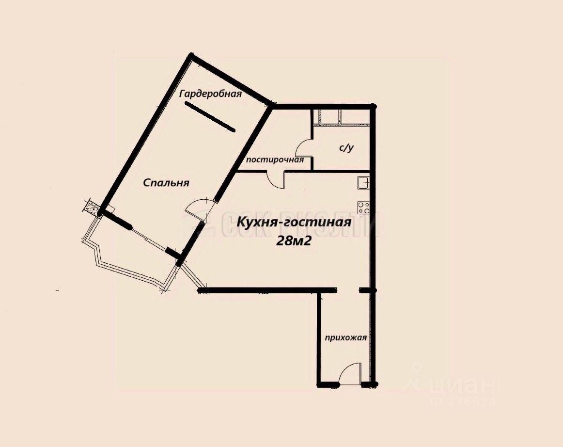 Планировочное решение: просторная кухня-гостиная площадью 28м2, спальня со своей гардеробной комнатой и возможностью организации рабочего места на утепленной лоджии, кладовая-постирочная, с/у.