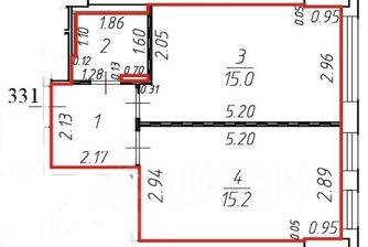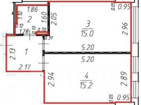 Общая площадь: 38,0м2, Европланировка: кухня-гостиная 15 м2, спальня 15,2 м2, совмещенный санузел с ванной 3,3 м2, прихожая 4,4м2.