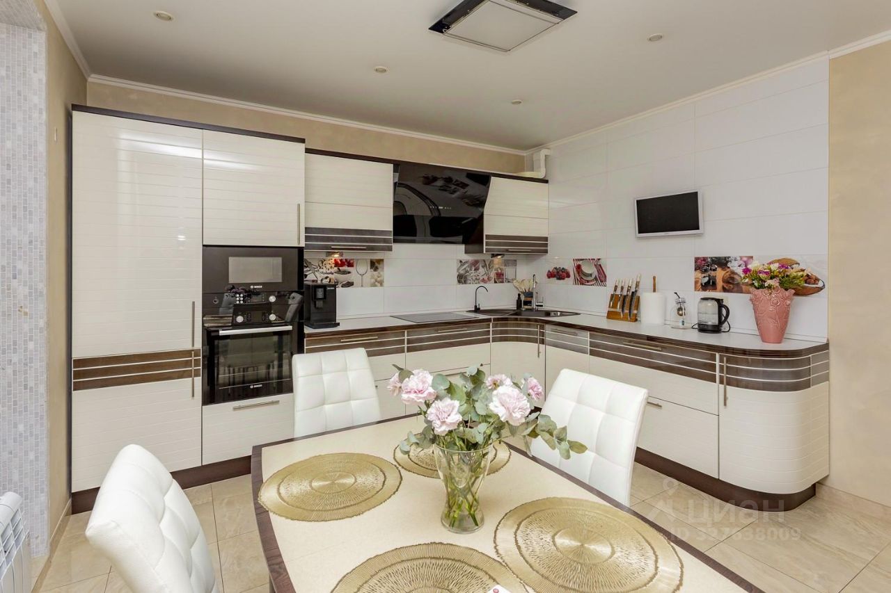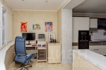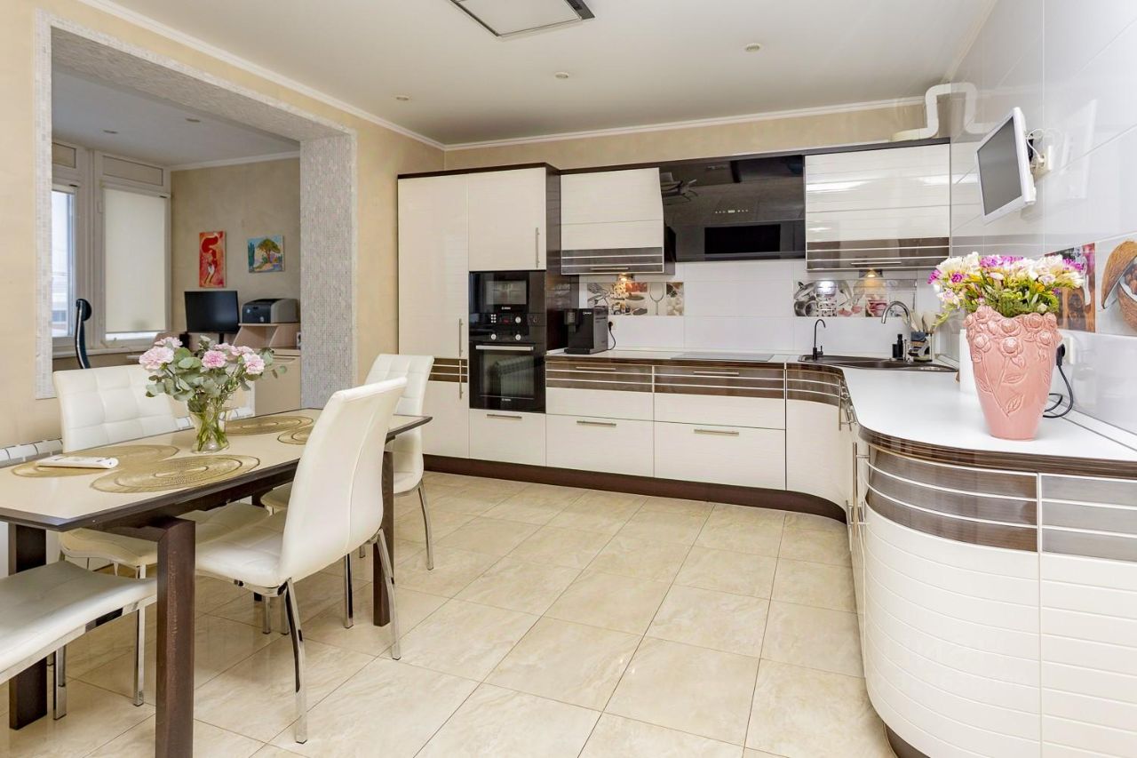 Открытый вместительный зал с диваном, пневмокреслом и панелью. Проходная мастер-кухня с выходом на балкон, который оборудован под кабинет. Уютная спальная комната. Светлая детская комната. Два санузла. Гардеробное помещение.
