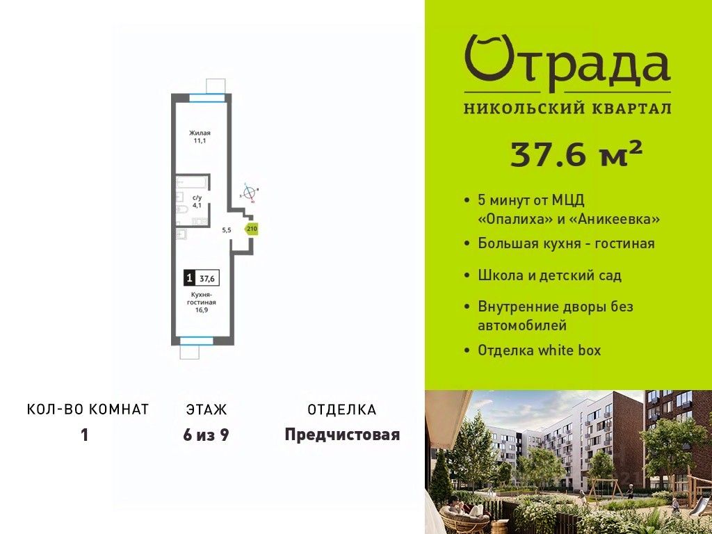 Однокомнатная квартира (евродвушка) с просторной кухней-гостиной в жилом комплексе комфорт-класса "Никольский квартал Отрада". Планировка выполнена по современным стандартам и отличается повышенным комфортом. Квартал расположен в удачной локации, которая сочетает благоприятную экологическую обстановку с прекрасной транспортной доступностью. Проектом предусмотрены 14 корпусов высотой 6-9 этажей, а также муниципальная школа, один муниципальный и один частный детский сад, два наземных многоуровневых паркинга с кладовыми помещениями. Надежный застройщик ГК "Отрада" с высочайшим рейтингом 5 звезд от портала ЕРЗ. Все корпуса во всех ЖК сданы раньше срока!