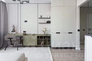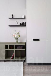 В студии есть вместительные шкафы и комод, рабочее место и шикарная кровать с подъёмным механизмом и большим пространством для хранения.