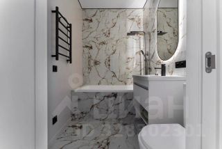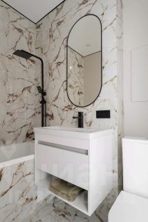 Просторный объединённый с/узел продуман до мелочей - выделена зона для стиральной машины,зоны для хранения, возможно, установить и сушильную машину.