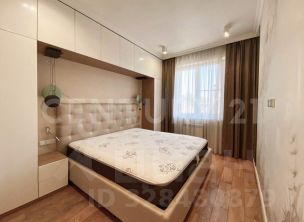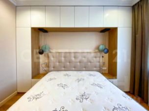 Спальня оформлена в спокойной, расслабляющей гамме: мягкое изголовье, встроенные шкафы и продуманное освещение создают атмосферу приватности и отдыха. Комната функциональна и не перегружена деталями.