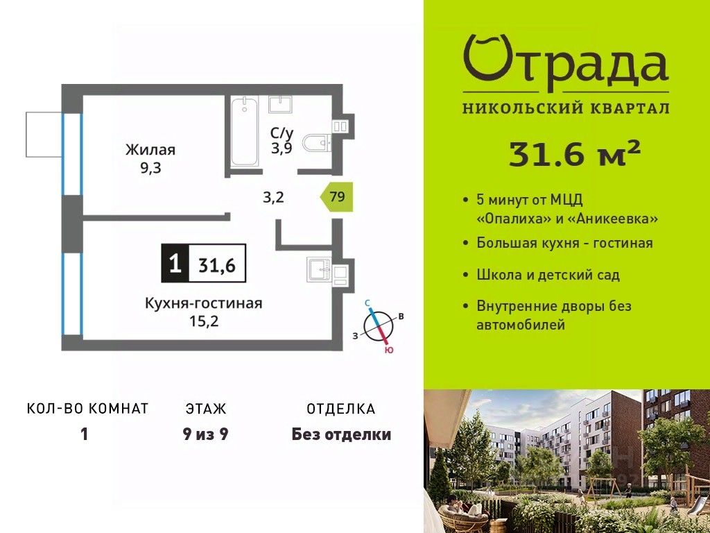 Однокомнатная квартира (евродвушка) с просторной кухней-гостиной в жилом комплексе комфорт-класса "Никольский квартал Отрада". Планировка выполнена по современным стандартам и отличается повышенным комфортом. Квартал расположен в удачной локации, которая сочетает благоприятную экологическую обстановку с прекрасной транспортной доступностью. Проектом предусмотрены 14 корпусов высотой 6-9 этажей, а также муниципальная школа, один муниципальный и один частный детский сад, два наземных многоуровневых паркинга с кладовыми помещениями. Надежный застройщик ГК "Отрада" с высочайшим рейтингом 5 звезд от портала ЕРЗ. Все корпуса во всех ЖК сданы раньше срока!