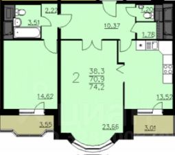 (Квартира выглядит как полноценная трёшка - 74,3 кв.м. Две мокрые точки. Если сделать полноценный капитальный ремонт, то один большой санузел можно оставить, а второй маленький санузел с кладовкой снести и сделать Кухню. Смотрите схему квартиры. Места достаточно. Инженер приходил объяснял именно так. И все зарегистрировать в БТИ. В итоге у Вас будет Трехкомнатная квартира. Перепланировка возможна ! )
