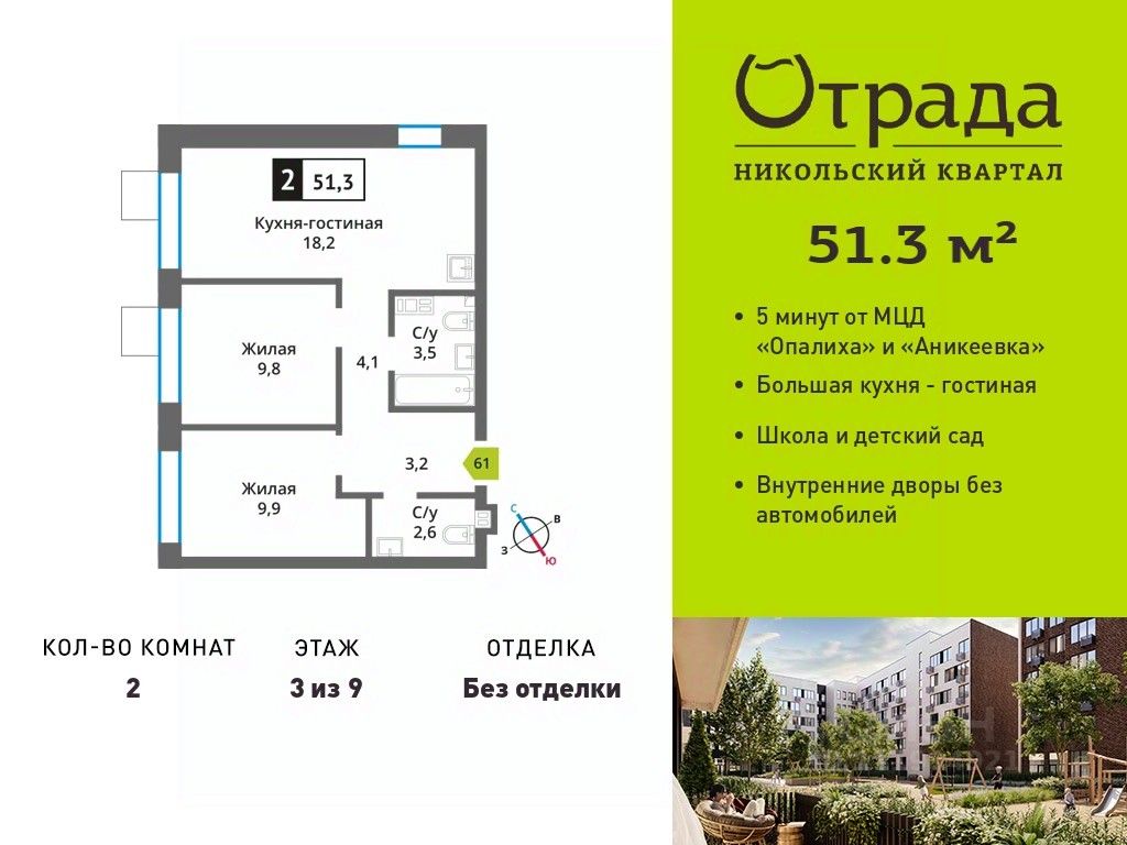 Двухкомнатная квартира (евротрешка) с просторной кухней-гостиной в жилом комплексе комфорт-класса "Никольский квартал Отрада". Планировка выполнена по современным стандартам и отличается повышенным комфортом. Квартал расположен в удачной локации, которая сочетает благоприятную экологическую обстановку с прекрасной транспортной доступностью. Проектом предусмотрены 14 корпусов высотой 6-9 этажей, а также муниципальная школа, один муниципальный и один частный детский сад, два наземных многоуровневых паркинга с кладовыми помещениями. Надежный застройщик ГК "Отрада" с высочайшим рейтингом 5 звезд от портала ЕРЗ. Все корпуса во всех ЖК сданы раньше срока!