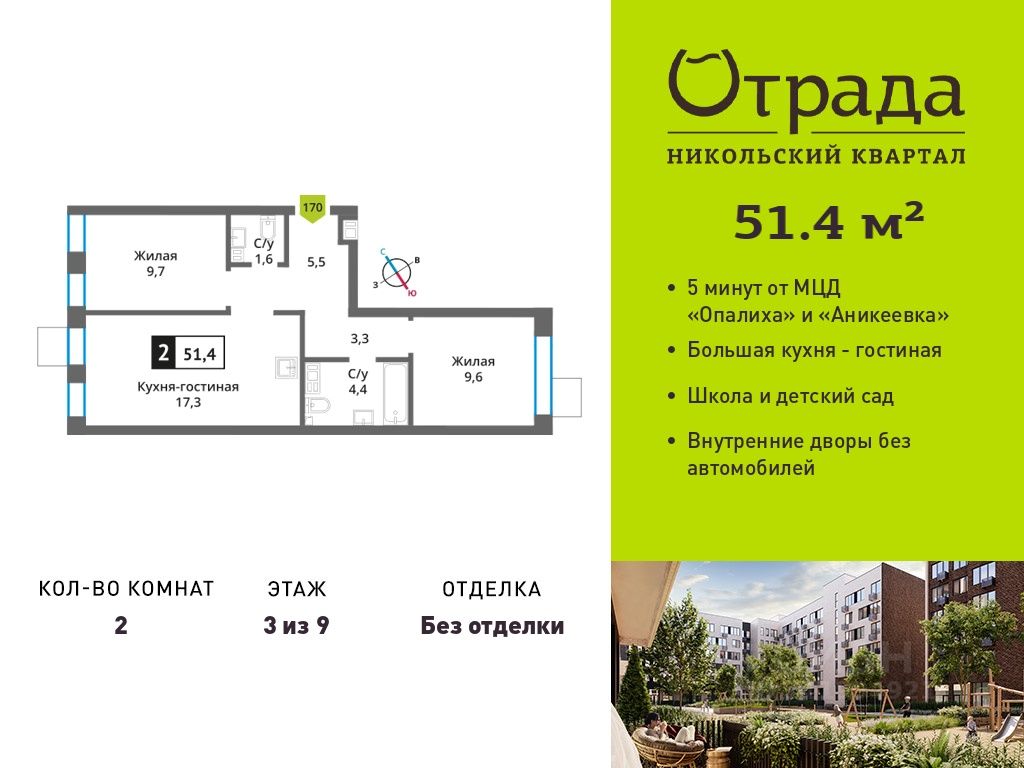 Двухкомнатная квартира (евротрешка) с просторной кухней-гостиной Двухкомнатная квартира (евротрешка) с просторной кухней-гостиной в жилом комплексе комфорт-класса "Никольский квартал Отрада". Планировка выполнена по современным стандартам и отличается повышенным комфортом. Квартал расположен в удачной локации, которая сочетает благоприятную экологическую обстановку с прекрасной транспортной доступностью. Проектом предусмотрены 14 корпусов высотой 6-9 этажей, а также муниципальная школа, один муниципальный и один частный детский сад, два наземных многоуровневых паркинга с кладовыми помещениями. Надежный застройщик ГК "Отрада" с высочайшим рейтингом 5 звезд от портала ЕРЗ. Все корпуса во всех ЖК сданы раньше срока!