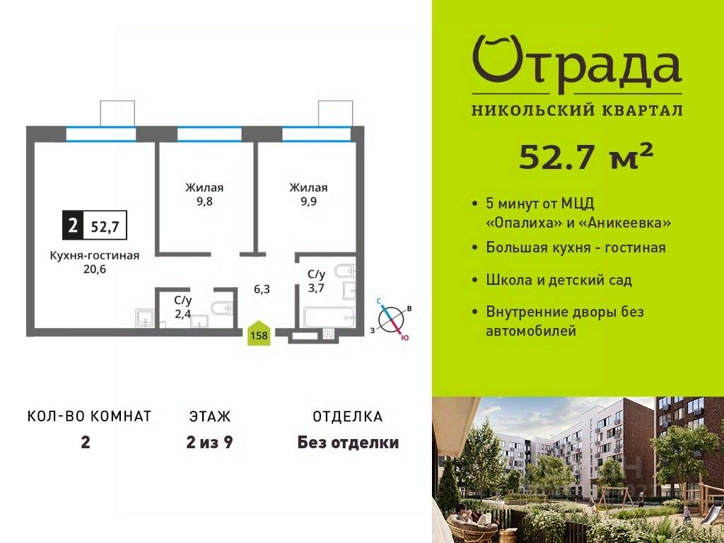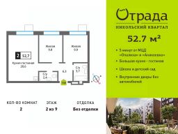 Двухкомнатная квартира (евротрешка) с просторной кухней-гостиной в жилом комплексе комфорт-класса "Никольский квартал Отрада". Планировка выполнена по современным стандартам и отличается повышенным комфортом. Квартал расположен в удачной локации, которая сочетает благоприятную экологическую обстановку с прекрасной транспортной доступностью. Проектом предусмотрены 14 корпусов высотой 6-9 этажей, а также муниципальная школа, один муниципальный и один частный детский сад, два наземных многоуровневых паркинга с кладовыми помещениями. Надежный застройщик ГК "Отрада" с высочайшим рейтингом 5 звезд от портала ЕРЗ. Все корпуса во всех ЖК сданы раньше срока!