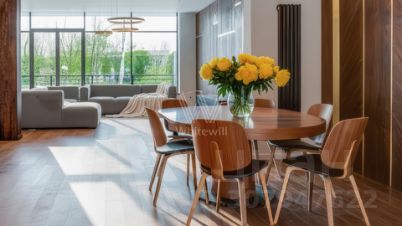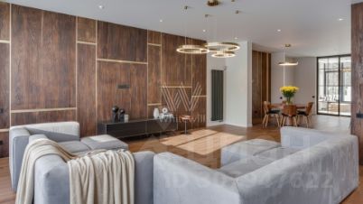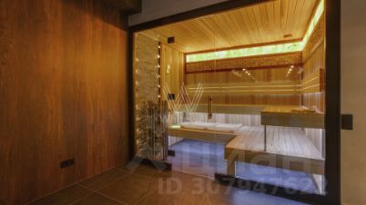 Резиденция Рублёво. Просторный таунхаус площадью 900 м² построен на прилесном участке 4,6 соток. В отделке интерьера в современном стиле использованы фактура дерева и камня. Благодаря панорамному остеклению пространство наполнено воздухом и светом. В резиденции разместили 5 спален, уютную гостиную с камином, кухню-столовую, из которой открываются виды на парковую зону, кабинет, тренажерный зал, домашний кинотеатр и террасу. В доме расположена спа-зона с бассейном длиной 5,5 метров, сауной и комнатой отдыха, в которой обустроены мини-кухня и барная стойка. Предусмотрен встроенный гараж на 1 машину. На участке можно выполнить ландшафтный дизайн и обустроить зону барбекю.