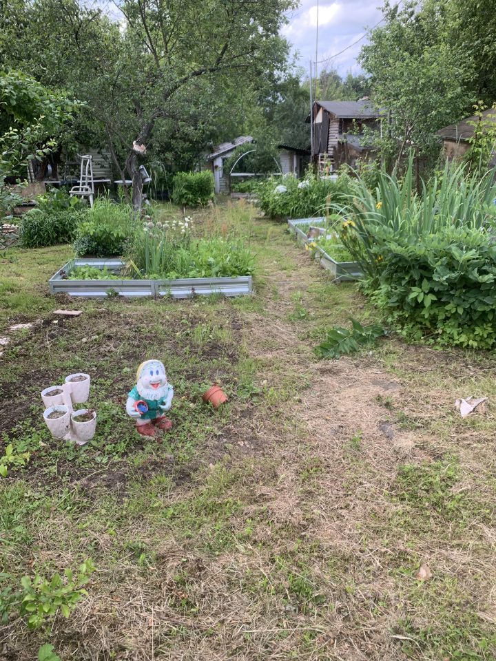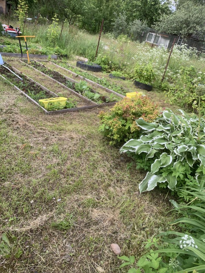 Множество плодоносящих деревьев и кустарников( смородина, крыжовник, яблони, сливы, груша, жимолость), многолетние цветы.