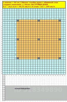 Максимальное пятно застройки дома: 9,5*10,5 п/м=99,75 кв/м 1 этаж, 3 эт.= 299 кв/м нового дома + чердак 95 м2;
