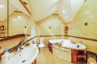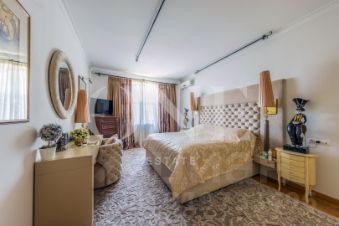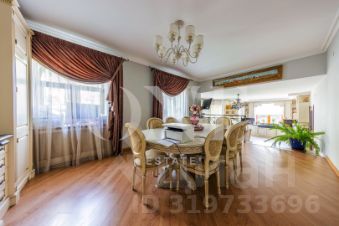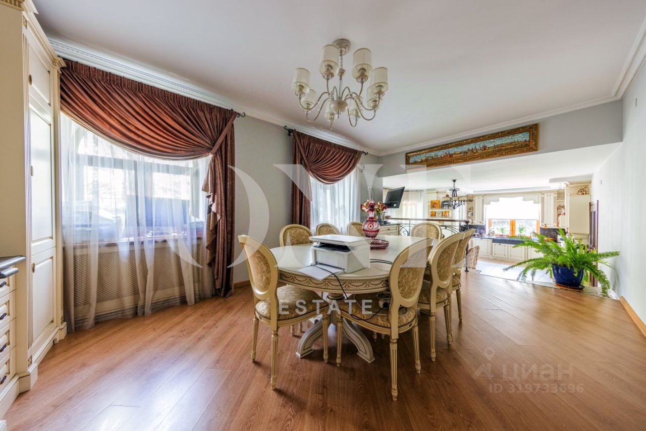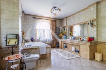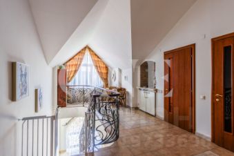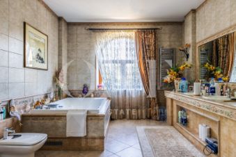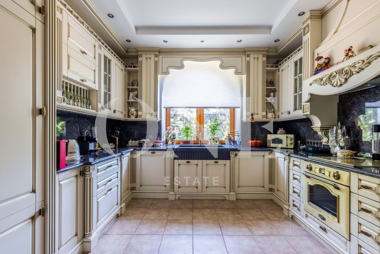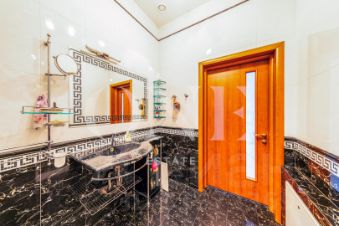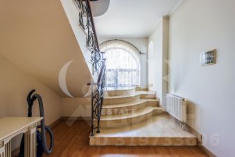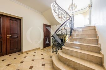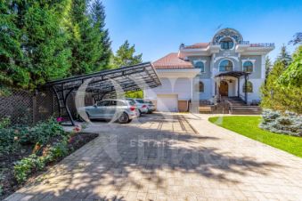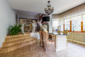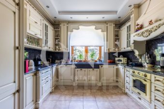 Дом построен из кирпича. Классический интерьер перекликается с удобной планировкой, выполненной по эксклюзивному заказу под большую семью. В доме есть помещение для персонала с отдельным входом. Предусмотрен встроенный гараж 90 кв.м для 3-х автомобилей. Всего на придомовой территории возможно разместить до 10 автомобилей.